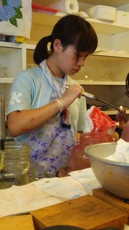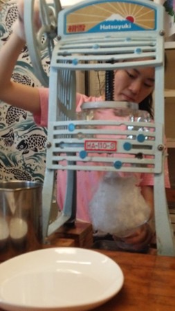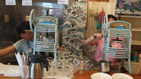 「ひみつ堂」店内のカウンター内では若い女の子達が一生懸命働いています。休むことなく、氷をかきき続ける・・