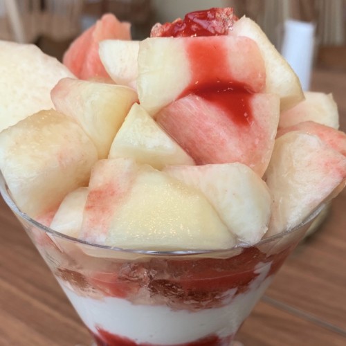 福岡の帰りに、キャンベル・アーリー 福岡空港店で時間を潰す間、最後に甘いものを頂きました。 モモのパフェです。