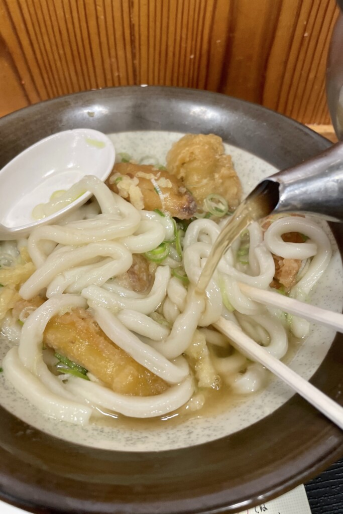 何故かというと、ちょっと食べているうちに、うどんがツユをどんどんと吸って、ツユが無くなってくるので、食べながらこれでツユを足していくようです。