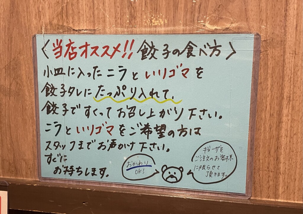 餃子には頼むとニラとゴマかついてきて、これにタレを入れてまぶしながら食べるのが食べ方という事でした。