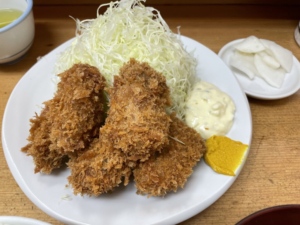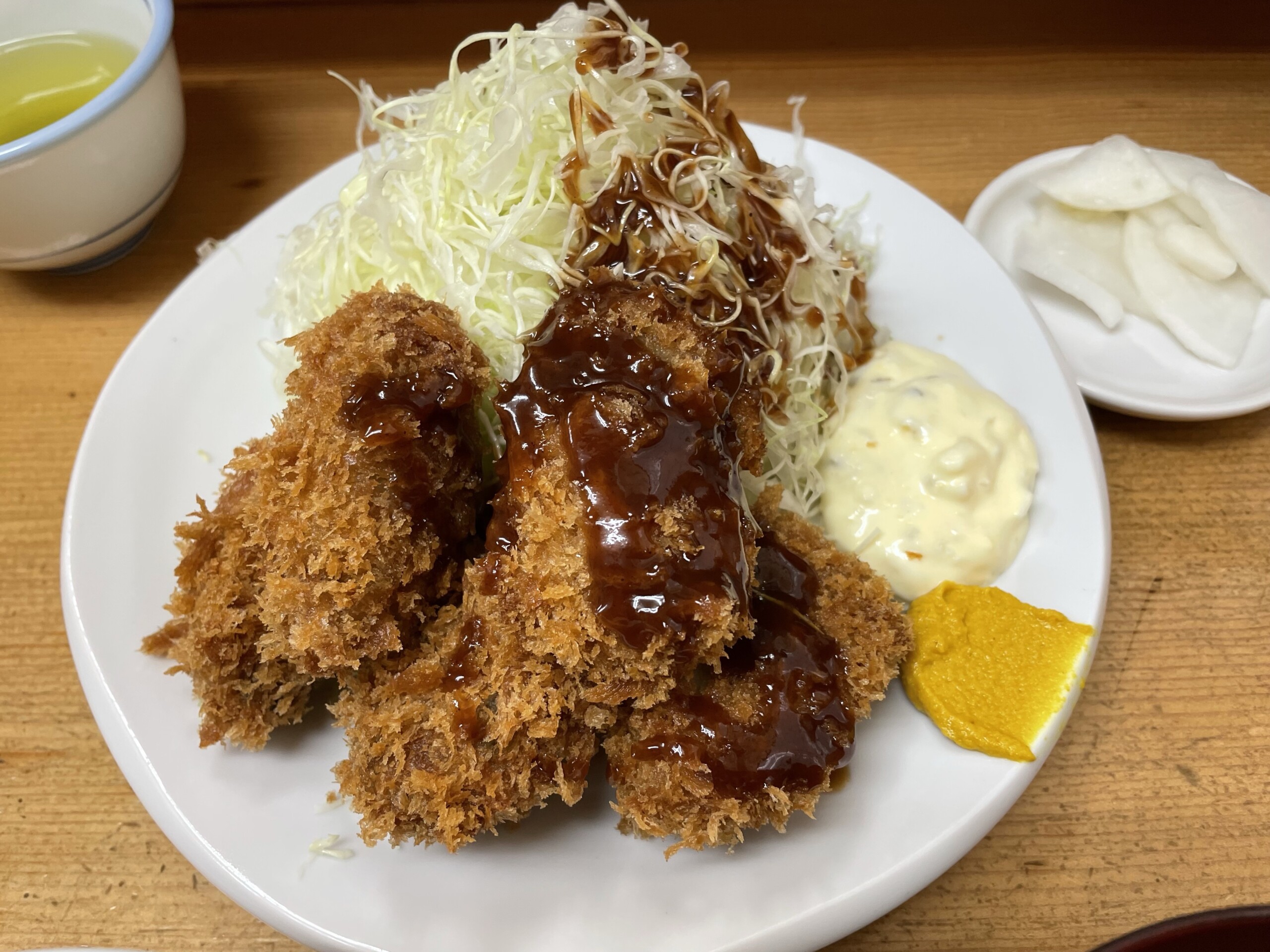 大きさは中程度ですが、5つのカキフライが積み上がっています。