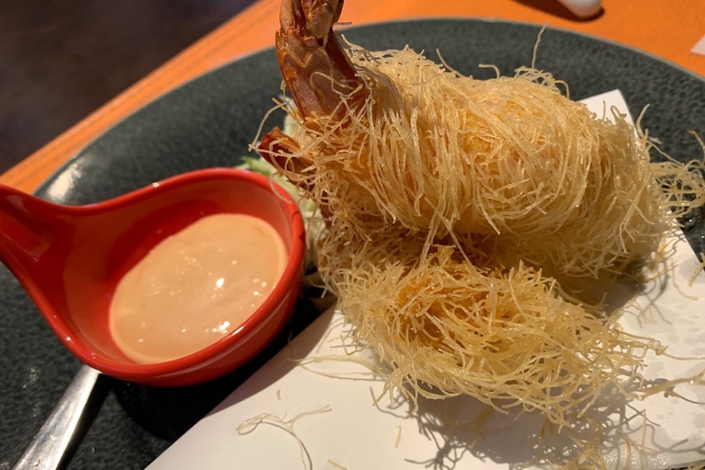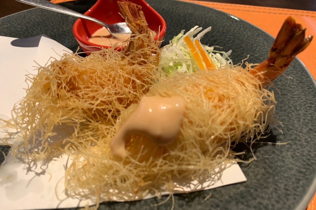 パリッとしたカダイフにすり身の上に海老を載せ揚げてある