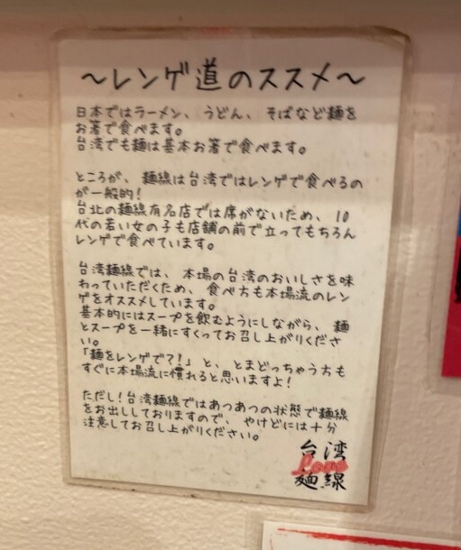 読んでみると、台湾では、麺線で有名な店舗などでは、席がなく立って食べる事が多いようで、その時はお箸ではなく、レンゲで食べるそうなので、是非本場の食べかたを・・と紹介してくれていました。