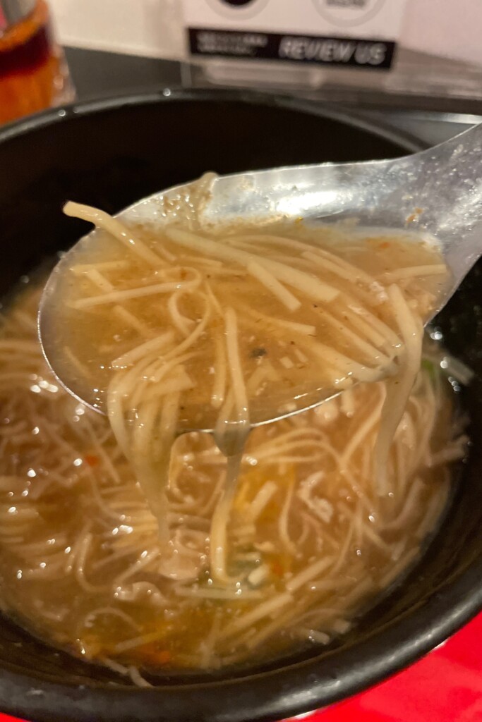 とろみのあるスープに入っていて、麺自体あまり長くなくぶつ切り状態になっている。