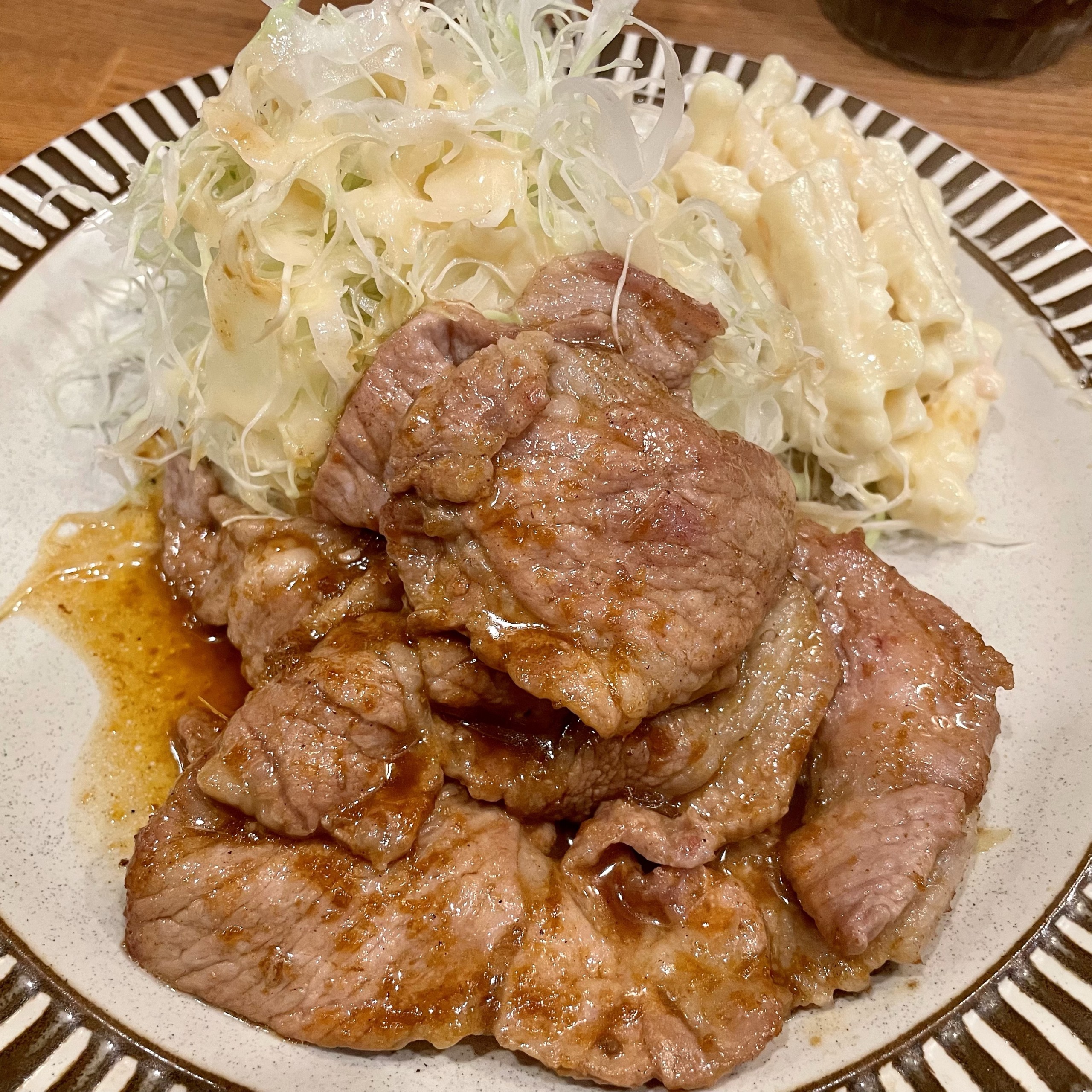 たっぷりのキャベツと、マカロニサラダの上にしっかりと狐色、いやいや、これぞ生姜焼き色の生姜焼きが盛られております。