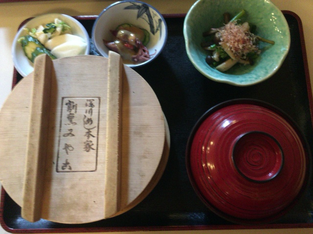 深川めしセットには小鉢が二つに、お吸い物と漬物がついてきます。