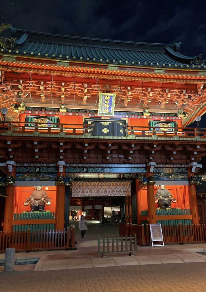 お店を出るともう辺りはすっかり暗くなっていて、神田明神の門の明かりがとても明るく感じました。