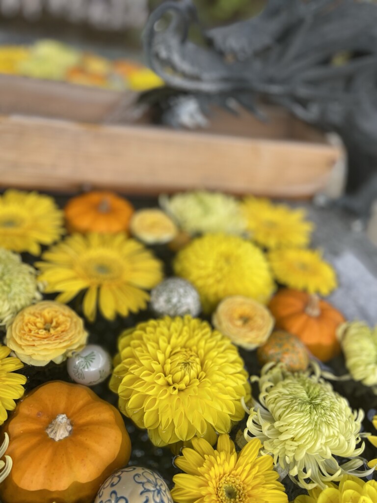 裏山道から入ると既に花手水の花が置かれています。