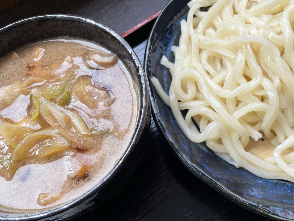 埼玉県産の豚バラ肉と丸太ねぎ、油揚げが煮込みました。自家製の出汁、コシのある手打ちうどんがとても美味しくて
