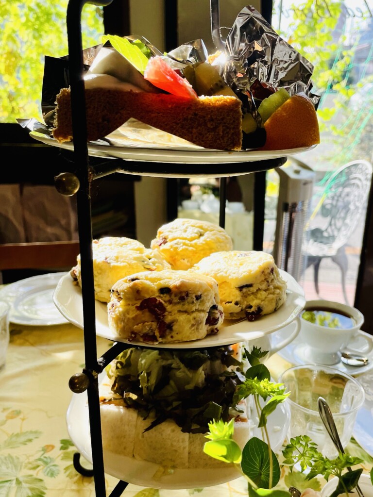 中断がスコーン、上段がフルーツとケーキ