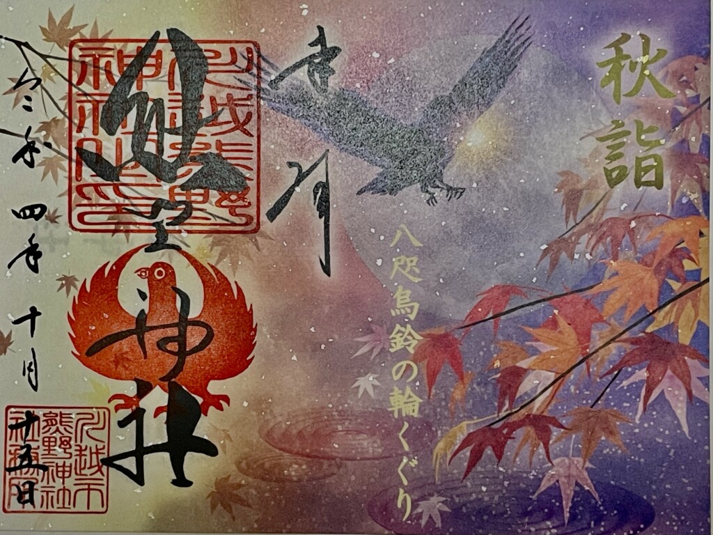途中、熊野神社にもよりました。八咫烏の鈴のくぐりを行い記念に御朱印も頂い来ました。