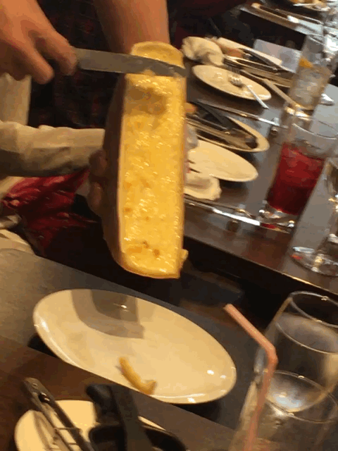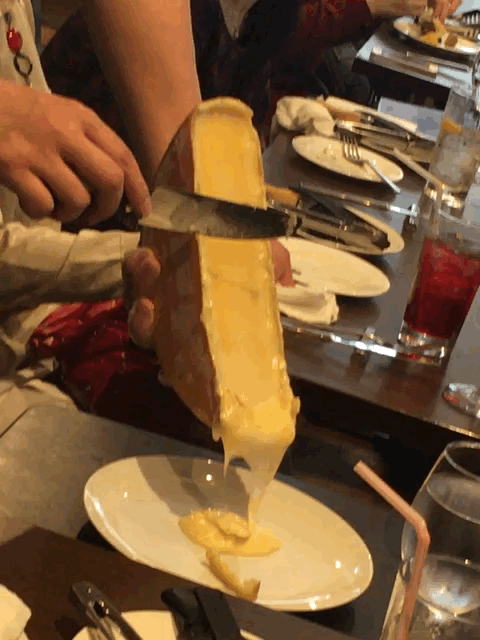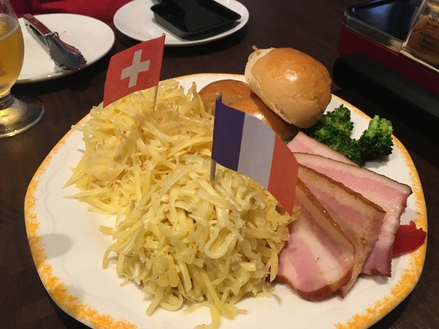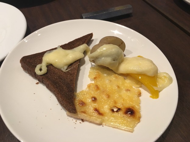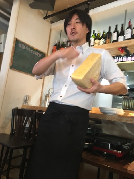 ちょっと分かりづらいですが、チーズをこれで暖めています。◯3ヶ国のチーズ目の前で削ぎ落して貰います。焼いた所を先に削り取り中のとろりチーズを掛けて貰います。