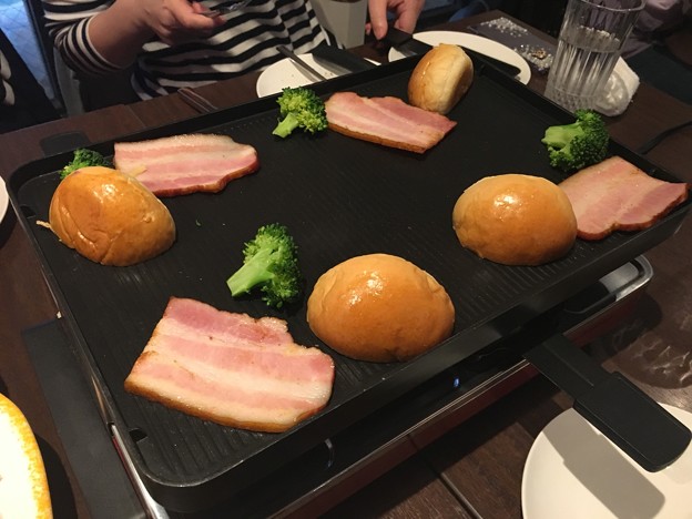 上の鉄板にはベーコンやパンなどを置いて焼き
