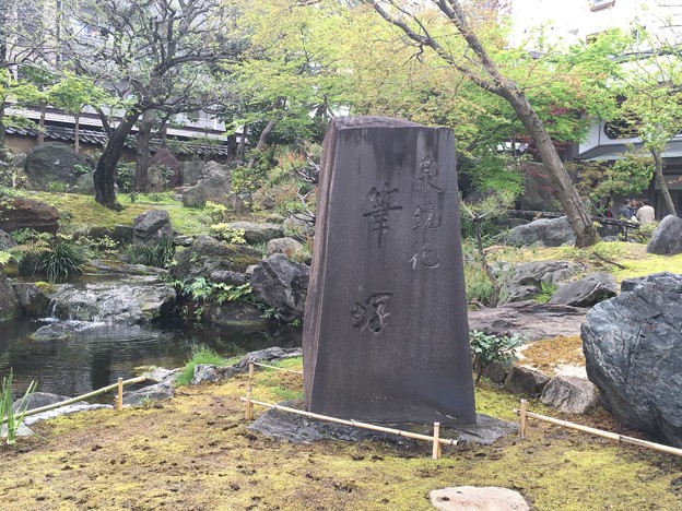 「切れるの別れるのッて、そんな事は、芸者の時に云うものよ。……私にゃ死ねと云って下さい。蔦には枯れろ、とおっしゃいましな。」のセリフでも有名なお蔦と主税の別れの場面である湯島の境内に、作者の泉鏡花の「筆塚」があります。