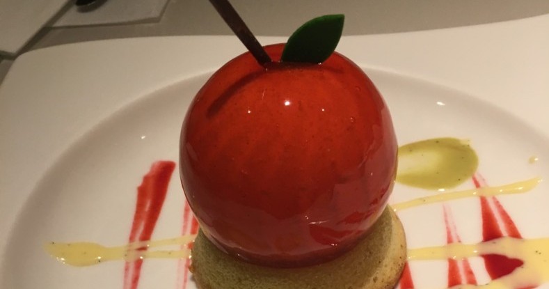 こちらも、アーモンドのパルフェといちごを閉じ込めたチョコレートのドームを、